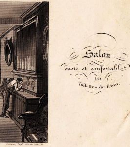 * With a detailed 77 x 137 mm steel engraving of the interior showing customers and barbers at work. ‘Taille de cheveux 50 c., Barbe 25 c., Coiffure 25 c. Salon vaste et confortable. 10 Toilettes de front.’ Lovely!