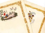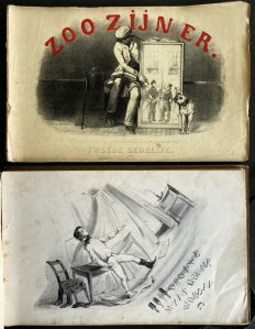 339. VER HUELL, Alexander, als ‘Alexander V.H.’ Zoo zijn er. (&) Zoo zijn er. Tweede gedeelte. Amsterdam, J.H. Gebhard & Co., ca. 1847. Oblong 16 x 25 cm in kartonnen map. 2 x 4 boekjes met elk 6 lithografieën, + voor beide gedeelten een titelpagina (50 litho’s, of 58 als men de omslagen meetelt). Met geïllustreerde omslagen (twee verschillende tekeningen). Meest met bijbehorende teksten. Het blanco achterblad van het laatste boekje ontbreekt, verder compleet. De eerste vier deeltjes wat sleets, rugjes ontbreken, omslagen en enkele bladen los. De tweede vier deeltjes in betere staat.