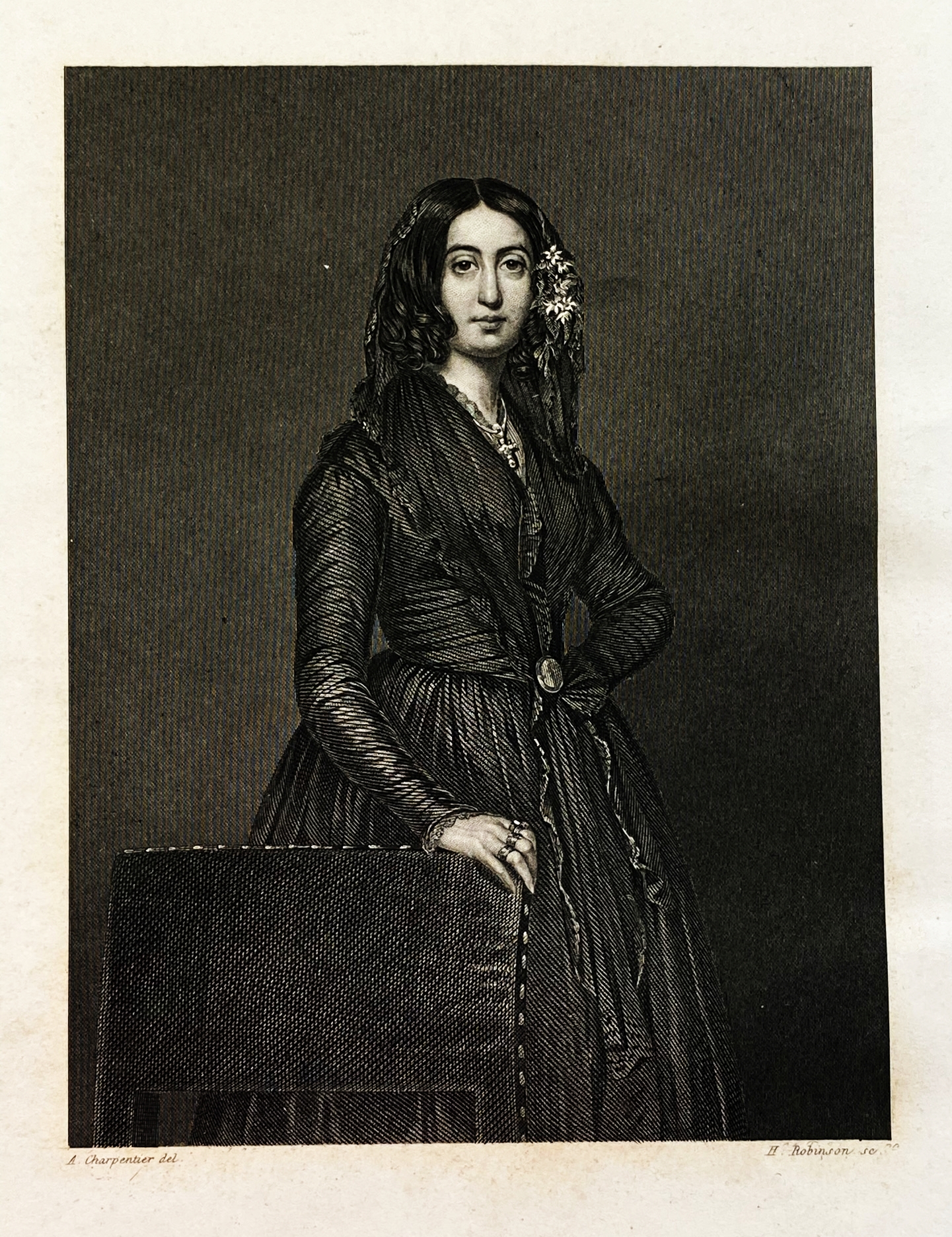 279. SAND, George Galerie des femmes de George Sand. Collection de 24 magnifiques portraits gravés sur acier par H. Robinson, d’après les tableaux de Madame Geefs [e.a.]. Avec un texte par Le bibliophile Jacob. Illustré de vignettes (…). Brussel, Société Belgede Librairie Hauman & Cie., 1843. 26 x 17 cm. Contemporain verguld halfleer met in blinddruk gestempelde linnen platten. (4), XVI, 174 p. Alle sneden verguld. Met 24 staalgravures, beschermd met een vloeiblaadje. 1e druk. Wat vlekjes, ouderdomssporen en slijtage, maar toch een mooi voorbeeld van een typisch 1840-er jarenboek. Klein heraldisch exlibris.