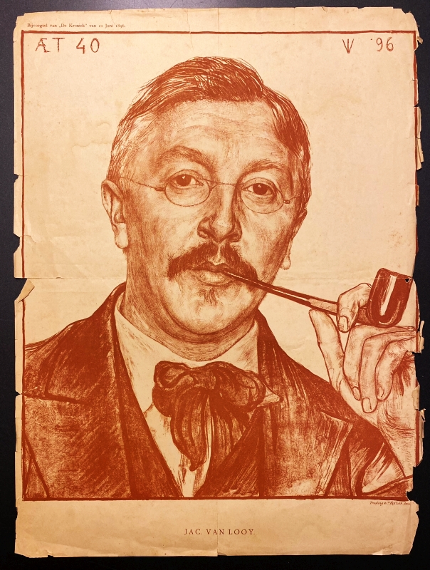 * Bijgevoegd: Portret van Jac. van Looy, lithografie van Jan Veth in bruinrood gedrukt en uitgegeven als bijvoegsel De Kroniek (van P.L. Tak) van 21 juni 1896. Bladformaat 43 x 33 cm, prentformaat 38 x 32 cm. Tweemaal gevouwen. In matige conditie: randslijtage, inscheuring op de vouwen. De rechtermarge is beschadigd. Toch een indrukwekkend, groot portret, waarvanuit de veertigjarige schrijver-schilder je opmerkzaam aankijkt, een pijp in de slanke vingers.
