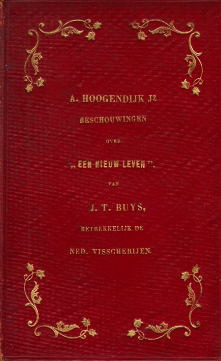 22. (BOEKBAND). HOOGENDIJK Jz., A. Eenige beschouwingen over ‘Een Nieuw Leven’, geschetst door den hoogleraar J.T. Buys, betrekkelijk de Nederlandsche visscherijen. Den Haag, Gebroeders Belinfante, 1867. 22 x 14 cm. Heelleer, verguld op het voor- en het achterplat. 44 p. Alle sneden verguld. 1e druk. Rugje wat gesleten. Binnenkneep achter ligt een beetje open. Op de titelpagina een oud stempel van de Koninklijke Bibliotheek met een tweede stempel ‘Verwijderd als doublet’.