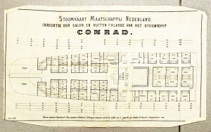 20. (CONRAD). STOOMVAART MAATSCHAPPIJ “NEDERLAND” Inrichting der salon en hutten 1e klasse van het stoomschip Conrad. Stoomvaart Maatschappij Nederland, Juli 1876. Eén blad dun papier, eenzijdig bedrukt. 28,5 x 49 cm (liggend formaat). Plattegrond van het achterdeel van het schip, waar de hutten lagen. Gevouwen, iets gerafeld langs de randen.
