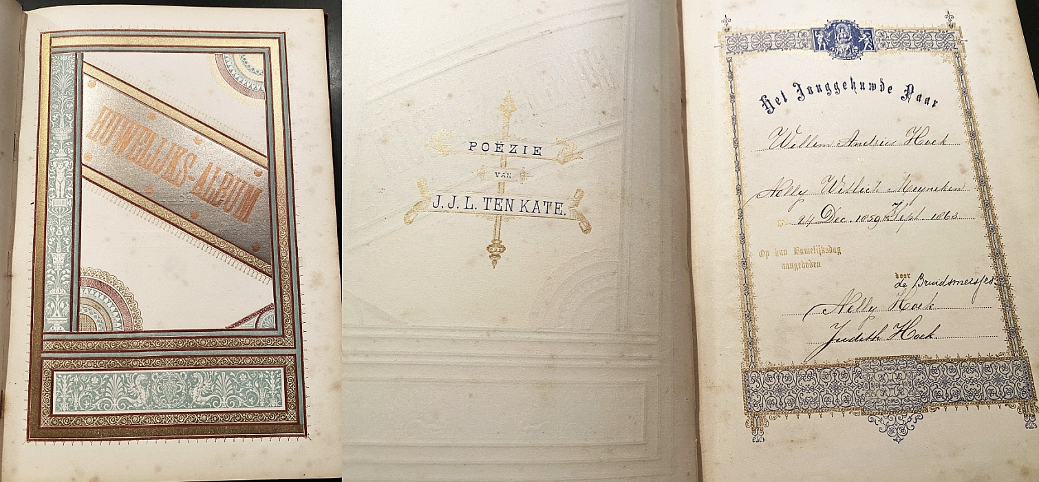 * Dit boek is in 1891 in gebruik genomen door Willem Hoek (1859-1919) en Nelly Witlich Meyneken (1863-1940), die in 1891 in het huwelijk traden, met als ambtenaar van de Burgerlijke Stand wethouder Milders (!), (1820-1900), terwijl het huwelijk werd ingezegend door Ds. Hooykaas. Vele handtekeningen, gedichten en teksten uit 1891, maar ook latere, tot en met 1943. Onder andere de families Hoos en Vervloet. Meer uitgebreid over de huwelijksreis naar Baden-Baden, de terugkomst naar het nieuwe huis, Lange Haven 21 in Schiedam, en de doop van het eerste kind, Frederik, in 1892 door Ds. Fr. Haverschmidt! In de twintigste eeuw worden er vooral namen, data en huwelijken in het boek geschreven, nieuwe namen zoals Lenglet en Scharroo, en de dubbele naam Witlich Hoek, die dus op het huwelijk van Willem en Nelly in 1891 teruggaat. Met fraaie zilver- en gouddruk, echt een keurig huwelijksboek in Victoriaanse stijl.
