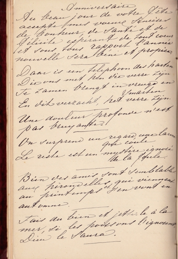 * In gebruik genomen door Helena Catharina Vorstius (1865-1960) in januari 1890. O.a. handtekeningen van Gerard Kruijff (1864-1921), met wie zij in 1894 zou trouwen, en diens broer Engelbert H. Kruijff Lz., geboren op ‘Het Oude Koningshuis’ te Sassenheim. Ook handtekeningen van M.A. Vorstius-Dubourcq en haar familieleden, W. Luden en Caro Luden-Van Laer, J.C. Sommer en M. Sommer-Kuller, M. Bodel Bienfait, Carel E. Mercier en verschillende leden van de familie Van Stipriaan Luiscuis, I.M.L. van de Blocquérie en Ida Haakman.