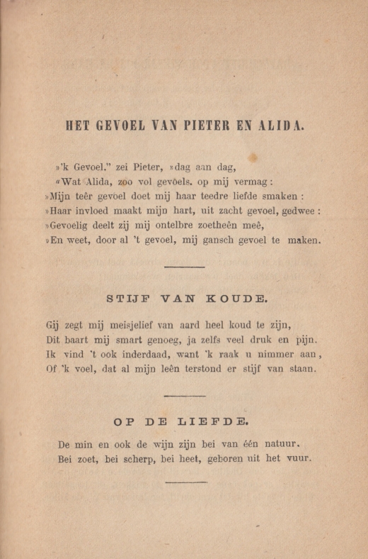 * ‘… vooral ook een dichtstuk voor besschaafde vrouwen. Men heeft voor haar sedert eenigen tijd het genot der poëzij onbereikbaar gemaakt door duistere, koude en raadselachtige diepzinnigheden, waarbij het hart ongeroerd blijft en het hoofd duizelt’, aldus Hendrik Tollens in zijn voorwoord. Roerende illustraties in fijngesneden houtgravures.
