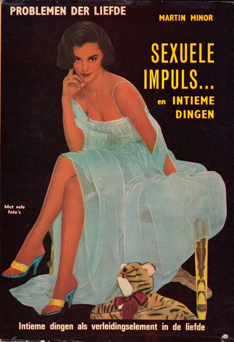 36. MINOR, Martin Sexuele impuls en… intieme dingen. Intieme dingen als verleidingselement in de liefde. Strombeek-Bever, De Schorpioen, (1960). Ingenaaid met stofomslag. 128 p. Met foto’s van dames in ondergoed en met tekeningen. 1e druk. Enkele pagina’s dubbel (foutief) gedrukt. Met vrijwel gaaf stofomslag.