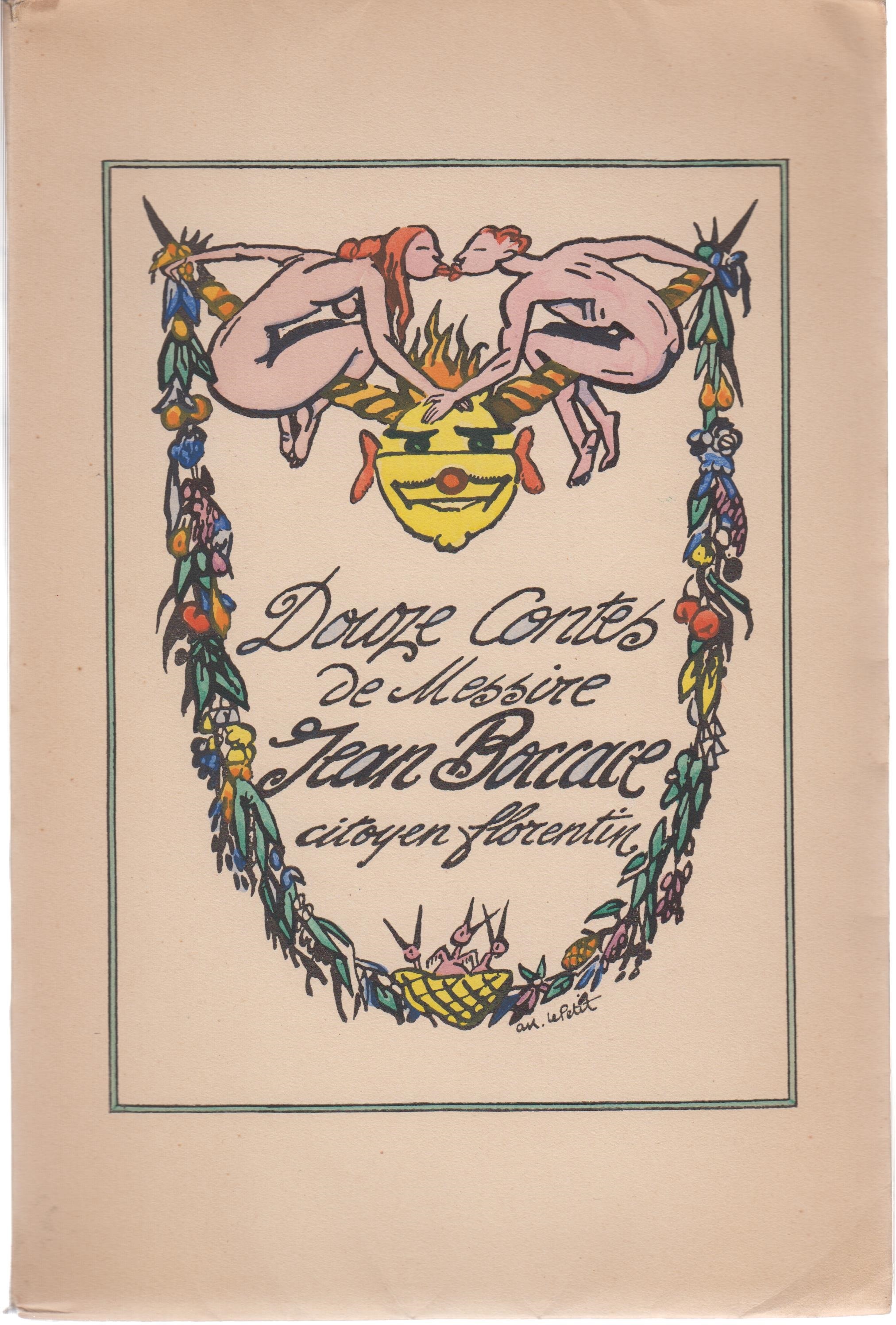 3. BOCCACCIO, Giovanni Douze contes de Messire Jean Boccace, Seigneur Florentin. Avec les illustrations en couleurs d’Alfred Le Petit. Parijs, Éditions René Kieffer, 1925. 25,5 x 16,5 cm. Ingenaaid. (8), 176 p. Geïllustreerd met pochoir. Gezet uit de letter Gravure/ Cochin en gedrukt in 600 genummerde exemplaren. Omslag op de rug iets gekreukt, maar een keurig exemplaar.