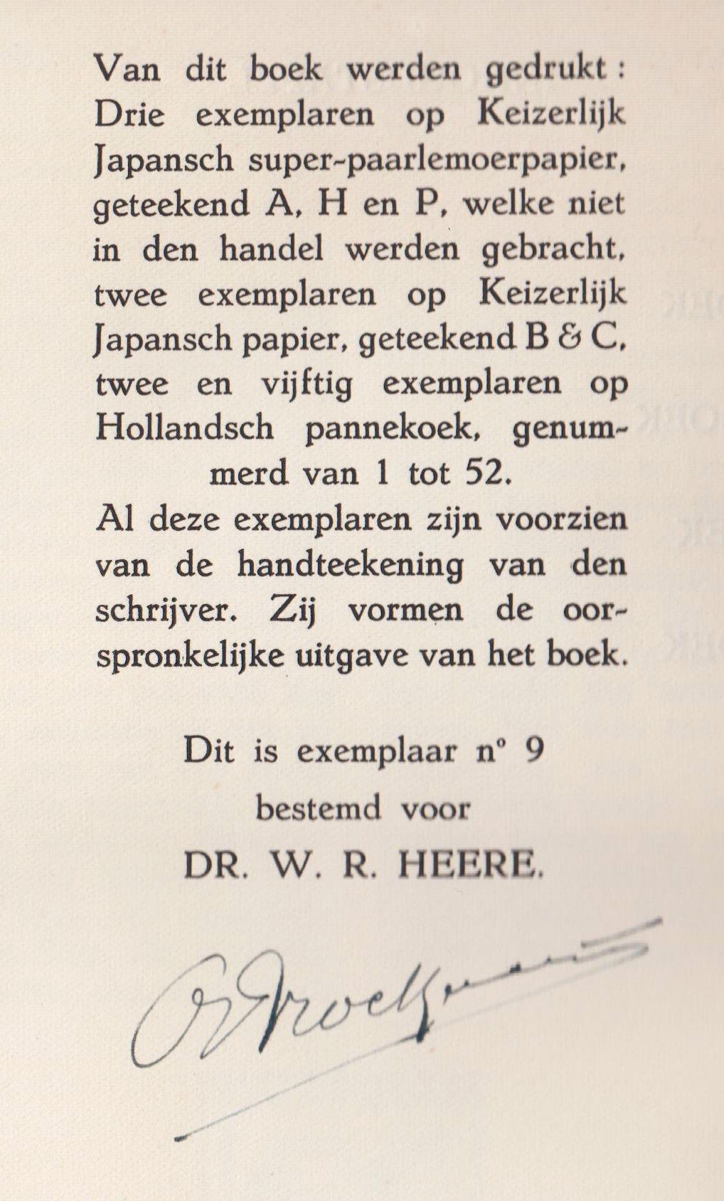 * Eén van de 10 geletterde luxe-exemplaren, gedrukt op Keizerlijk Japansch Mitsumata. Dit fraaie exemplaar, genummerd ‘A.1’, heeft bovendien een handgeschreven opdracht van de auteur onder het colofon en een handgeschreven gedicht op de titelpagina: ‘voor Suzanne,/ Met haat beladen was dit oog/ geen oogenblik, tenzij/ voor wie zich aan dien blik bedroog;// en zoo geen stond, van u tot mij,/ genegenheid mij loog:/ zoo is mijn hart u zeer nabij./ Raymond’. Is deze Suzanne, ontvanger van het eerste exemplaar, wellicht de dochter van de dichter?