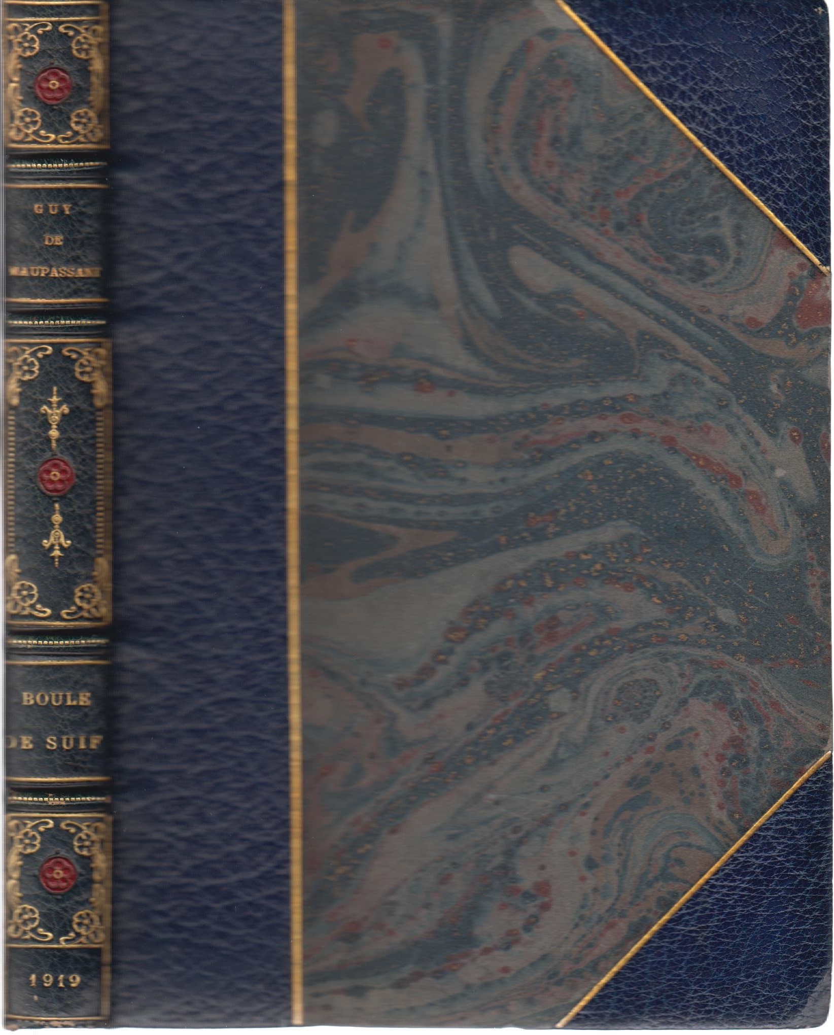 8. (BOEKBAND). MAUPASSANT, Guy de Boule de suif et Le vengeur. Illustrés de huit compositions par Fred Money. Gravées sur bois par Clément et Deloche. Parijs, Librairie des Amateurs/ A. Ferroud, F. Ferroud, 1919. Rijkverguld halfmarokijn met inlegwerk, leren hoeken en gemarmerde platten. Origineel omslag en rug meegebonden. (8), 110 p. Geïllustreerd. Met leeslint. Gedrukt in 1250 genummerde exemplaren. Hoekjes iets gebutst.