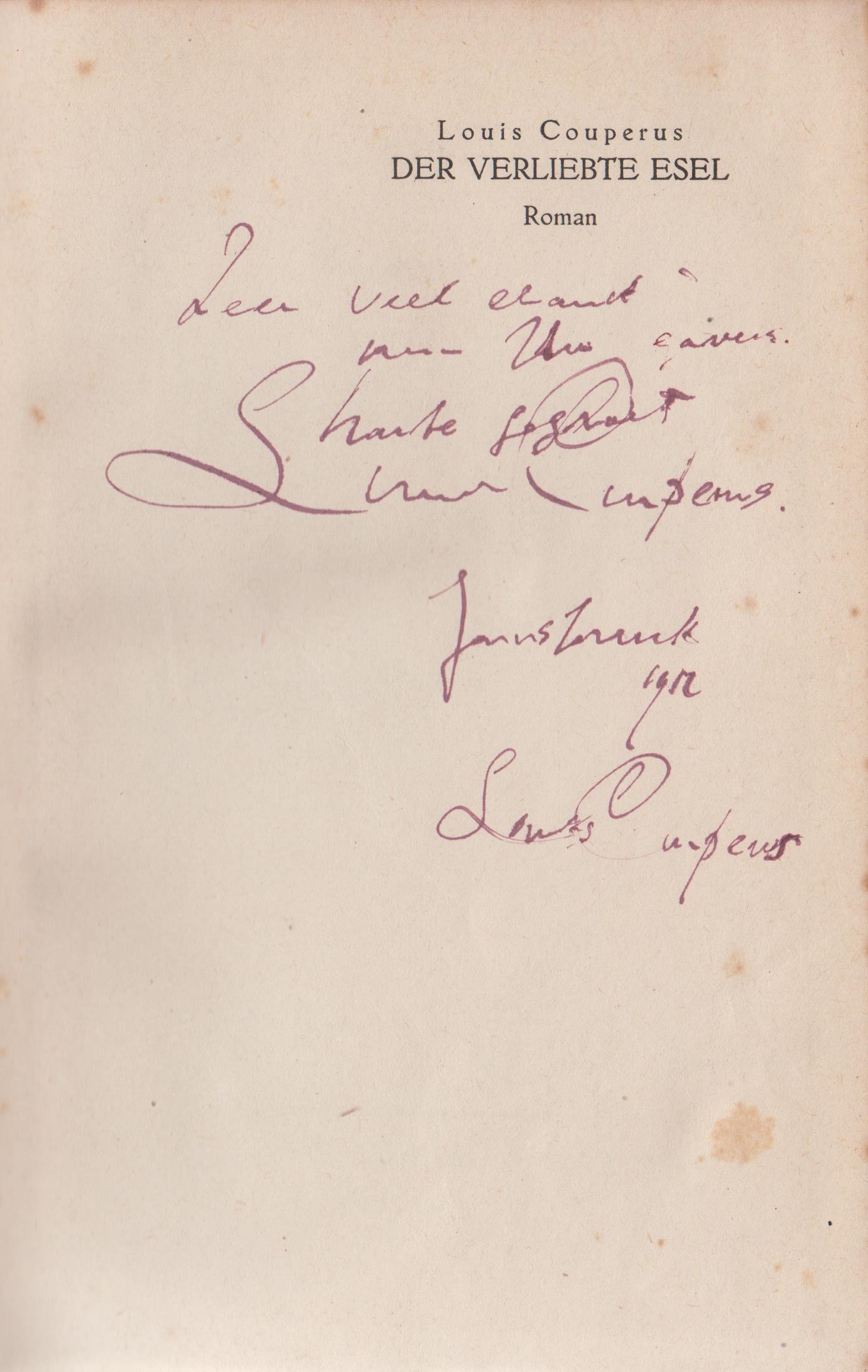 44. COUPERUS, Louis Der verliebte Esel. Einzig berechtigte Übertragung von Else Otten. Berlin, Wilhelm Borngräber, [1920]. Halflinnen. 184 p. 1e-5e 1000-tal. Rug iets verbleekt en met wat roest. Met op de Franse titel een handgeschreven opdracht in paarsbruine inkt, tweemaal gesigneerd ‘Louis Couperus’, gedateerd ‘Innsbruck 1912’. Ook de titelpagina is in dezelfde hand gesigneerd.
