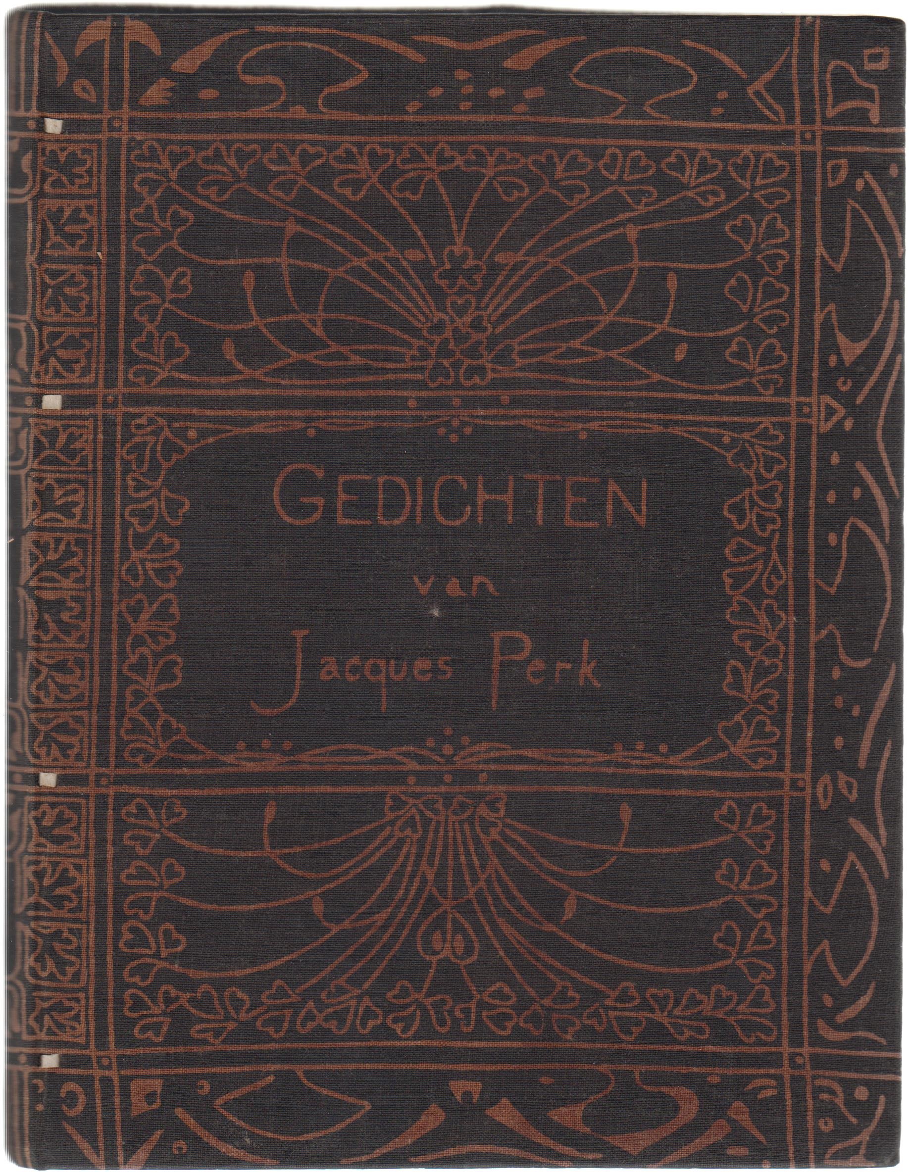 4. PERK, Jacques Gedichten. Met Voorrede van Mr. C. Vosmaer en Inleiding van Willem Kloos. (..) Vercierd door T. Nieuwenhuis. Amsterdam, Van Looy, 1897. Gedecoreerd linnen (batik). (2), 198 p. 2e druk. Zwevende schutbladen iets verbruind, maar een fantastisch (ongerestaureerd) exemplaar, zónder de gebruikelijke beschadigingen en/of reparaties.