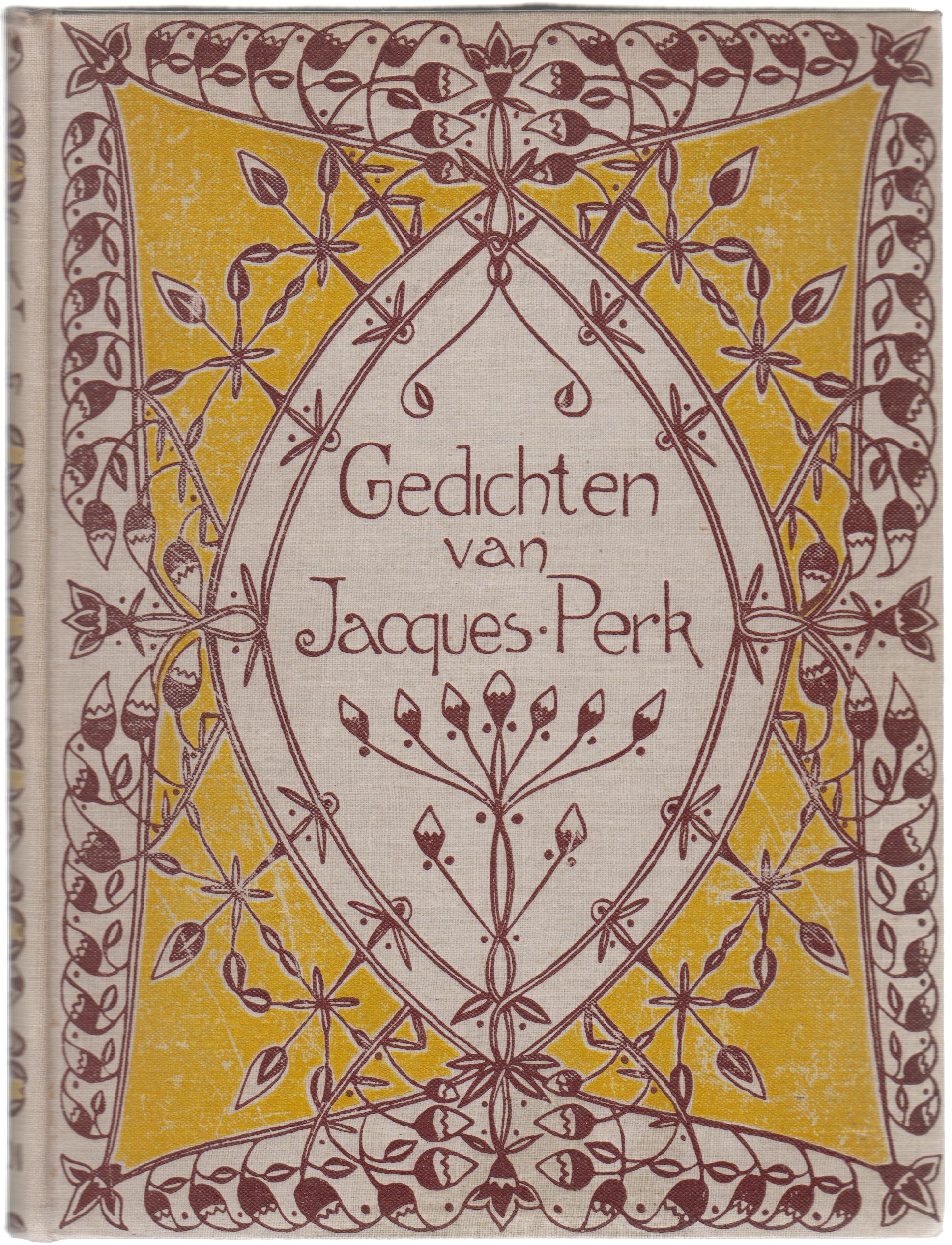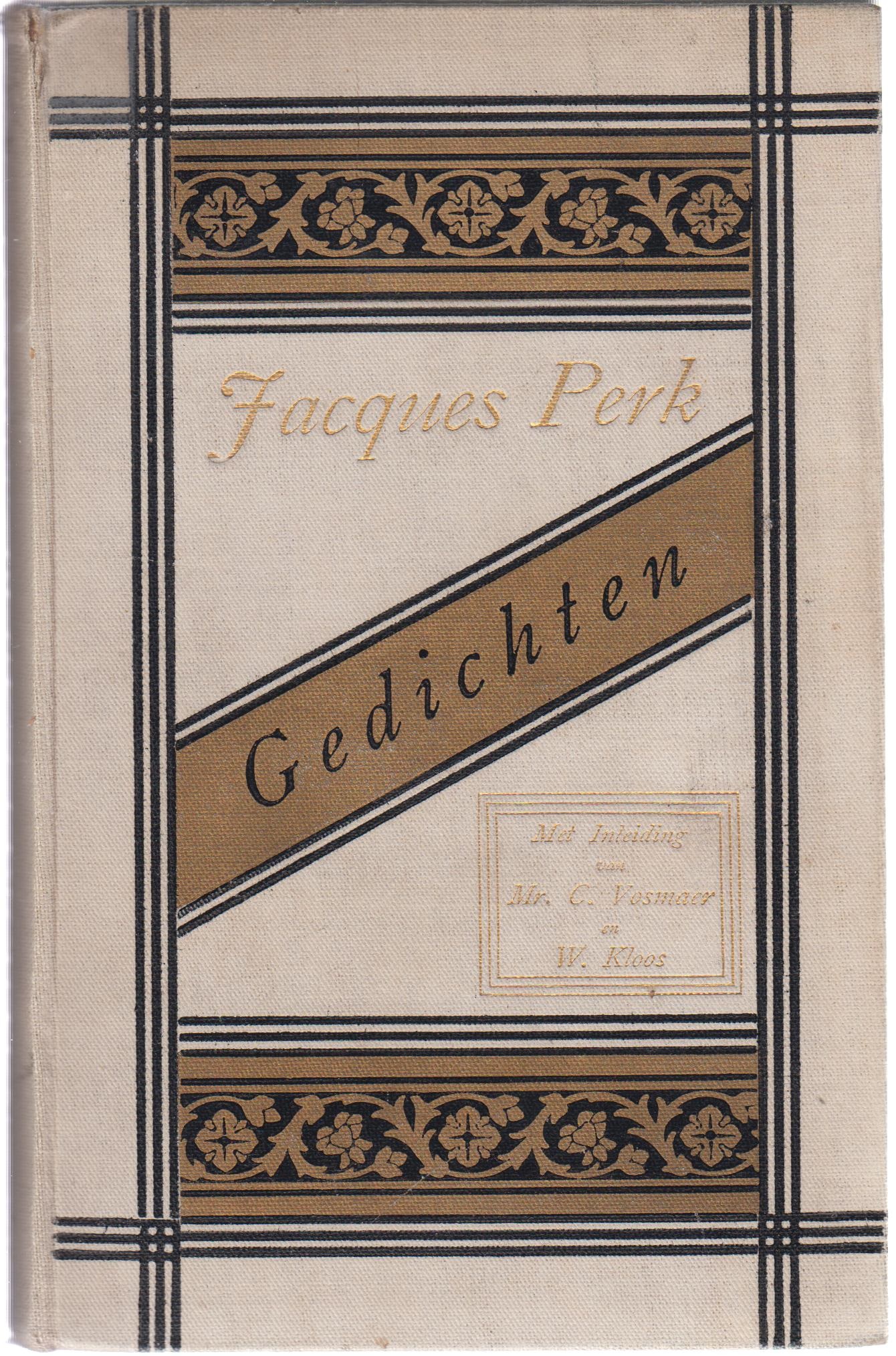 6. PERK, Jacques Gedichten. Met Voorrede van Mr. C. Vosmaer en Inleiding van Willem Kloos. (..) Vercierd door T. Nieuwenhuis. Amsterdam, Van Looy, 1898. Verguld linnen. (4), 190 p. 2e [= 3e] druk (‘Goedkoope Uitgave’). Mooi exemplaar.
