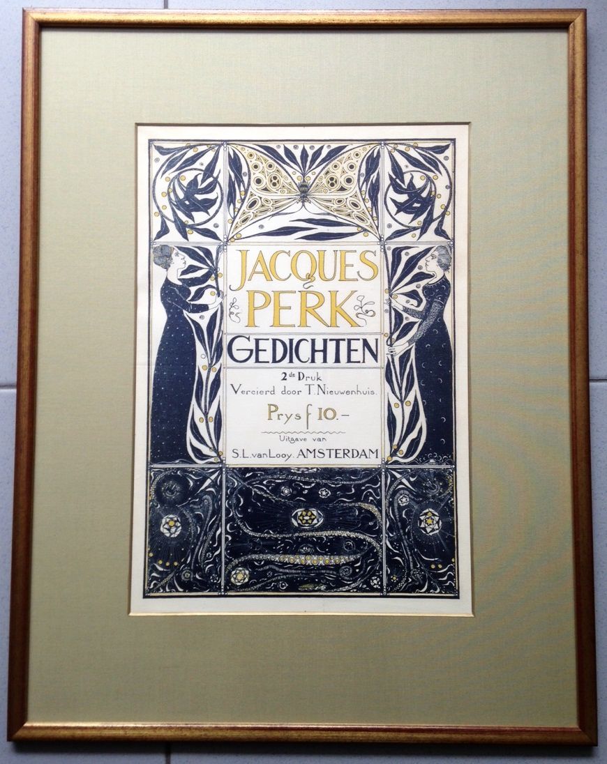 3. PERK, Jacques Raambiljet voor Jacques Perk, Gedichten. 2de Druk. Vercierd door T. Nieuwenhuis. [1897]. Originele kleurenlitho. Horizontale en verticale vouw (niet storend). Ingelijst achter glas (lijst: 60 x 47 cm). Onder passe-partout (litho zichtbaar: 40,5 x 28 cm). Door ons niet uit de lijst gehaald.