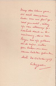 * Eén van de 30 door de schrijver gesigneerde en genummerde exemplaren. Volgens het colofon werden de eerste tien nummers door J. Wansink met de hand gebonden. Dit is nummer 12, maar het is ook met de hand gebonden, zo te zien door Jan Wansink. Vormgeving en druk van Charles Nypels. Van Laar 27.