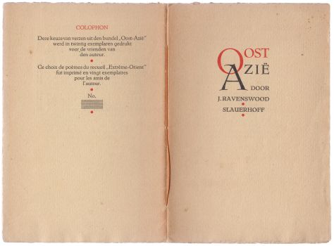 65. SLAUERHOFF, J. Oost-Azië. [Zonder plaats, eigen beheer, 1928]. Ingenaaid. 20 p. Gedrukt [door Nypels] in rood en zwart op getint gevergeerd Bührmann in een oplage van slechts 20 genummerde exemplaren. 1e druk.