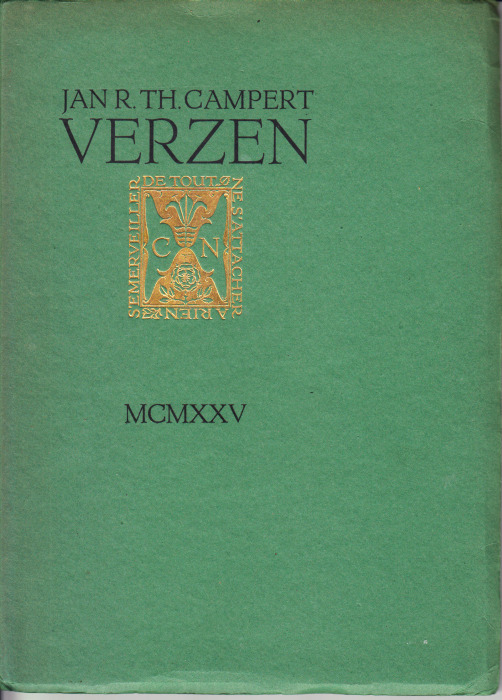 5. CAMPERT, Jan Verzen. (Etiket op omslag). Maastricht, Charles Nypels, 1925. Ingenaaid. (2), 64 p. Gezet uit de Erasmus Mediæval en gedrukt in rood en zwart in een oplage van 250 genummerde exemplaren. Verguld uitgeversvignet op omslag. 1e druk. Etiket op omslag. Bibliotheekstempels op p. (1) en p. (12).