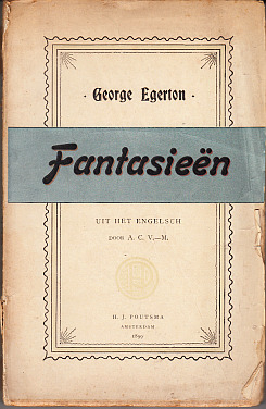14. EGERTON, George Fantasieën. Uit het Engelsch vertaald door A.C. V.-M. Amsterdam, H.J. Poutsma, 1899. 22 x 14 cm. Ingenaaid. (4), 108 p. Niet afgesneden. 1e druk. Omslag op rug en randen versleten, wat roest.