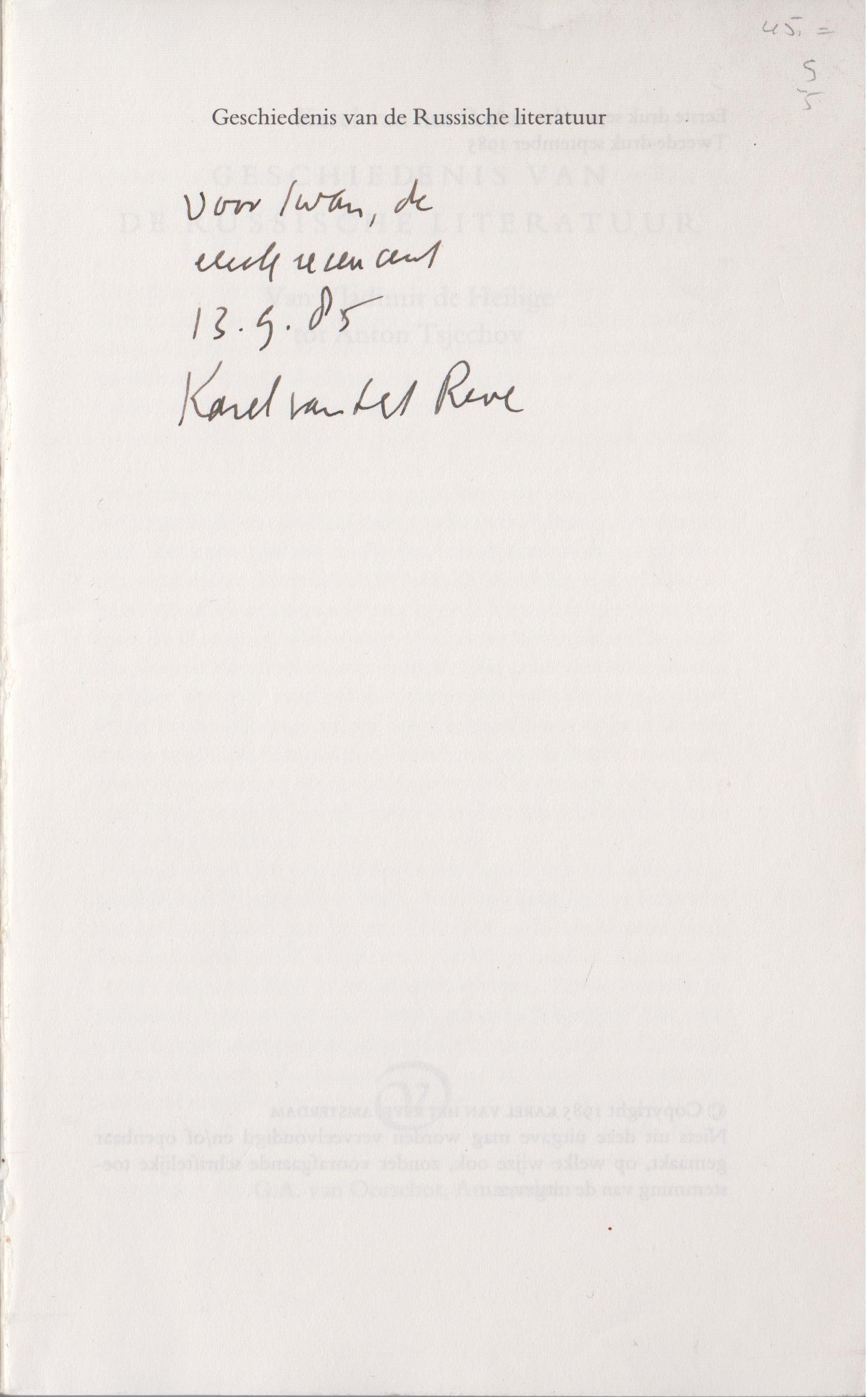 * Exemplaar met handgeschreven, gesigneerde opdracht van de auteur op de Franse titel: ‘Voor Iwan [Sitniakowsky], de/ ideale [?] recensent/ 13.9.85/ Karel van het Reve’.
