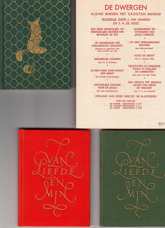 Voorts: Twee originele reclamefolders uit 1941: De Dwergen. Kleine boeken met grooten inhoud. Verzorgd door J. van Krimpen en S.H. de Roos. Reclamefolder. 22 x 8 cm. 4 p. Met kleine notitie in pen achterop: ‘najaar ’41’, en groen stempel van Boekhandel “Plus-Ultra” in Amsterdam.