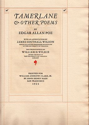 * Een zeer bijzondere luxe uitgave met een uitzonderlijk mooie editie van Tamerlane en een herdruk van de eerste druk van 1827. William Andrews Clark, zoon van een kopermiljonair, was een groot boekenverzamelaar en filantroop, onder meer de stichter van het Los Angeles Philharmonic.