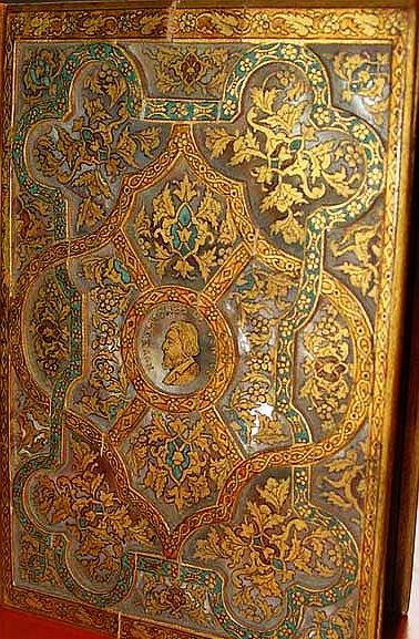 17 (BOEKBAND, VENETIË, 1900). RUSKIN, John The Stones of Venice. New York, Merrill & Baker, (ca. 1880-1900). 8vo. Lederen rug met platten van ingelegd parelmoer, met een portret van Ruskin op de voorzijde en een Leeuw van Venetië op het achterplat in parelmoer getekend, omgeven door in parelmoer getekende decoraties, gevat in een raamwerk van verguld en gekleurd, gebogen hout en messing. 324 p. Kopsnede bewerkt met een raamwerkje met bloemetjes, en vervolgens verguld. Rugje wat versleten. Houtjes niet allemaal even vlak.