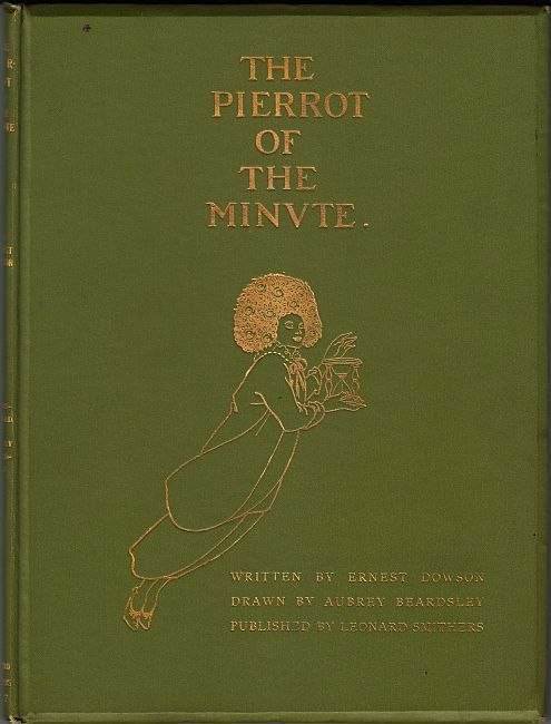 6 (BEARDSLEY, Aubrey). DOWSON, Ernest The Pierrot of the Minute. Londen, Leonard Smithers, 1897. Origineel verguld groen linnen met ontwerp van Beardsley op voor- en achterzijde. (2), 46 p. Geïllustreerd met een frontispice, twee vignetten en een initiaal van Beardsley. Gedrukt in slechts 330 exemplaren. 1e druk. Met klein exlibris van Gerrit Komrij. Enkele minuscule vlekjes, maar de band is mooi en het goud schittert helder.