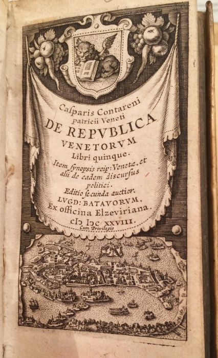 * De eerste druk van deze klassieke tekst over Venetië verscheen na kardinaal Contarini’s overlijden, in 1543. Een mooi verzorgd boekje, pocket van de Gouden Eeuw. Willems 293.