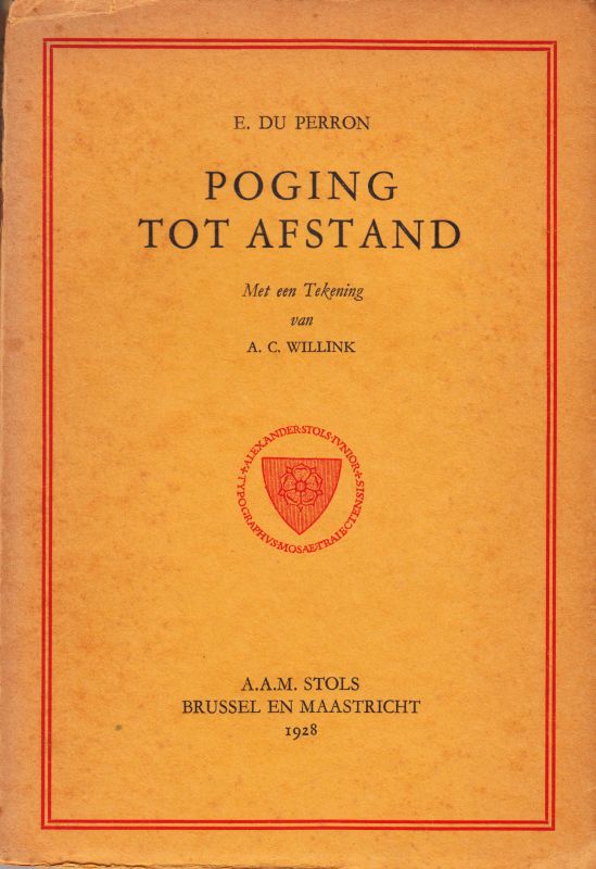26. PERRON, E. du Poging tot afstand. Met een Tekening van A.C. Willink. Brussel/ Maastricht, Stols, 1928. Ingenaaid. 96 p. Gedrukt in een oplage van 265 exemplaren. 2e druk. Rug verbruind. Eerste en laatste pagina roestig.
