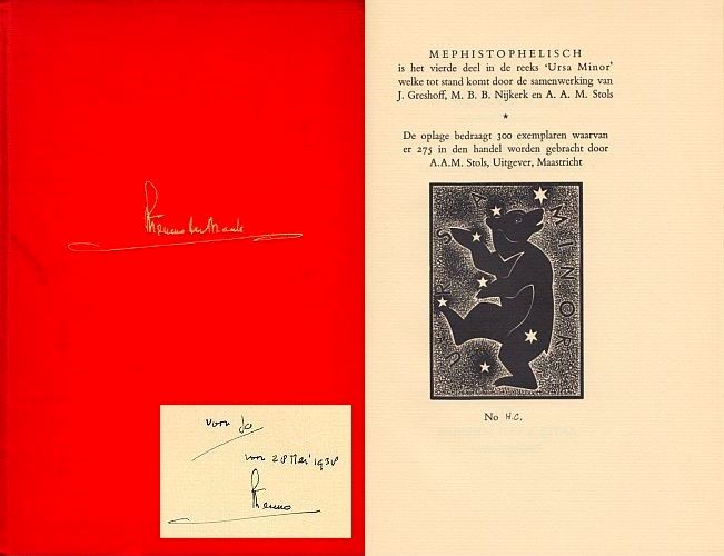 7. BRAAK, Menno ter Mephistophelisch. (Maastricht, A.A.M. Stols), 1938. Linnen. (2), 62 p. Gedrukt in rood en zwart in een oplage van 300 genummerde exemplaren. 1e druk. Vaag veegje op voorplat.