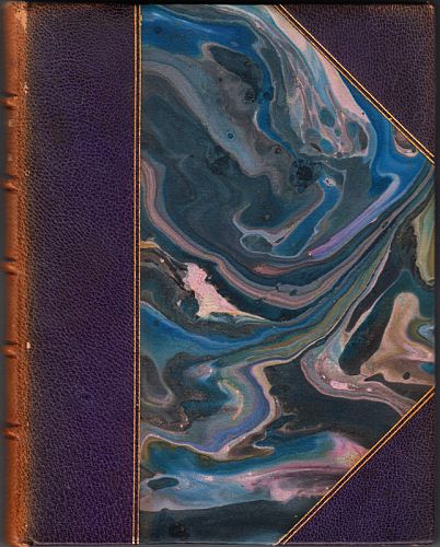 16. GIDE, André Moer. Vertaling M. Nijhoff. Brussel, A.A.M. Stols, [1944]. 17 x 13 cm. Herbonden in paars halfleer met hoeken en gemarmerde platten (5 ribben), origineel omslag meegebonden. Kop verguld. 116 p. Gezet uit de Garamond en gedrukt in rood en zwart op velijn in 125 genummerde exemplaren. 1e druk in boekvorm. Rug verkleurd, klein schaafplekje.