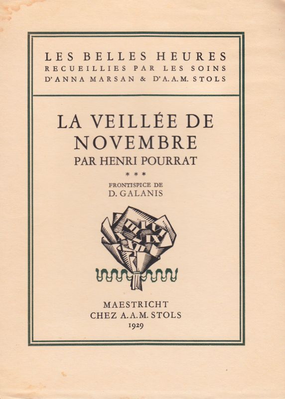 22. (MESSIAEN, Olivier). POURRAT, Henri La veillée de Novembre. Frontispice de D. Galanis. Maastricht, A.A.M. Stols, 1929. Les Belles Heures IV. Ingenaaid. (4), 120 p. Met een originele ets van Demetrios Galanis. Gedrukt in 480 genummerde exemplaren. 1e druk. Vochtvlekje bovenaan de rug. Wat roest. Prent wat watervlekkig.