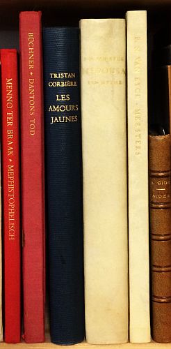 11. CORBIÈRE, Tristan Les amours jaunes. La Haye/ Paris, A.A.M. Stols, 1947. Linnen. (2), XX, 274 p. Gezet uit de Lutetia en gedrukt in blauw, oranje en zwart in een oplage van 667 genummerde exemplaren.