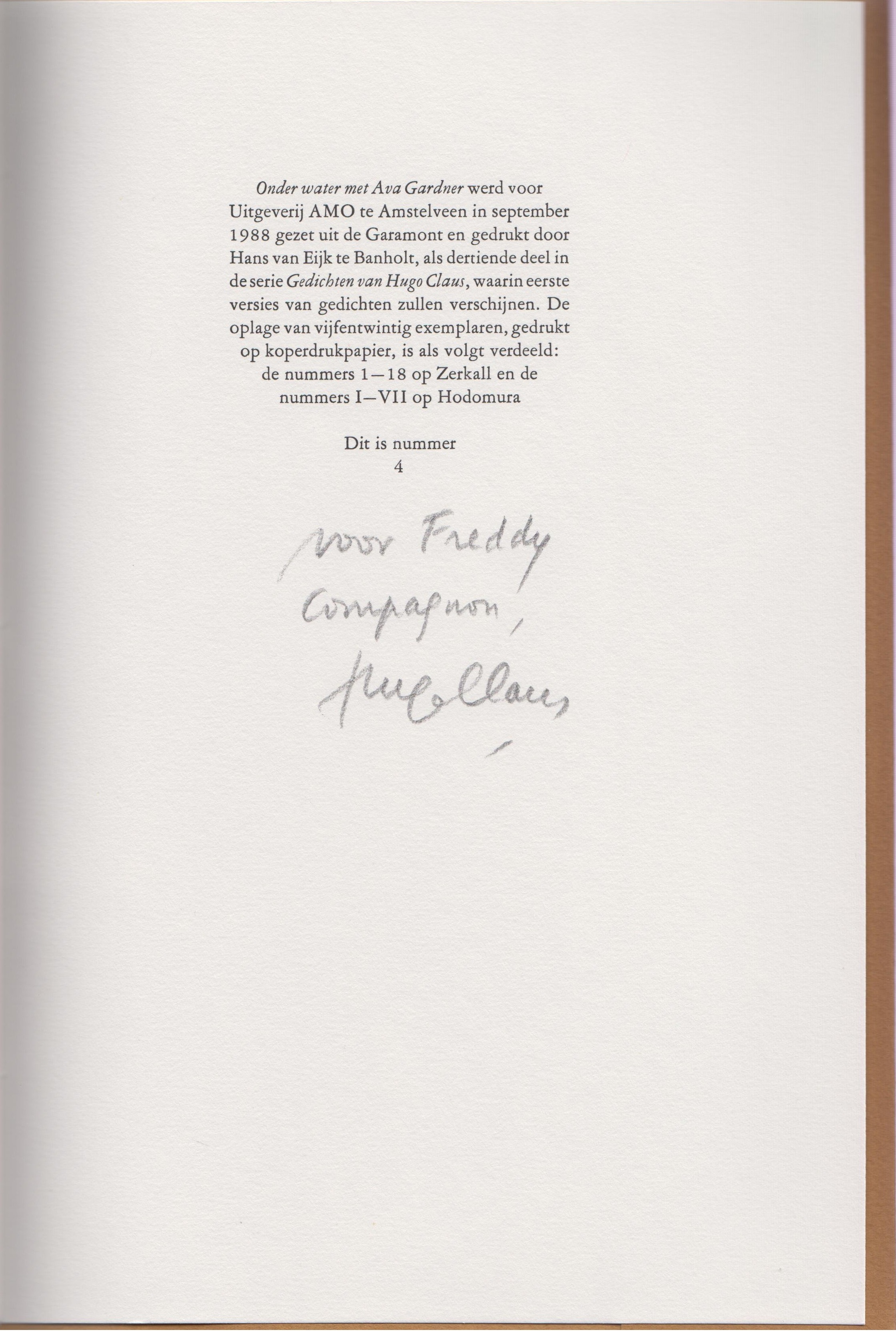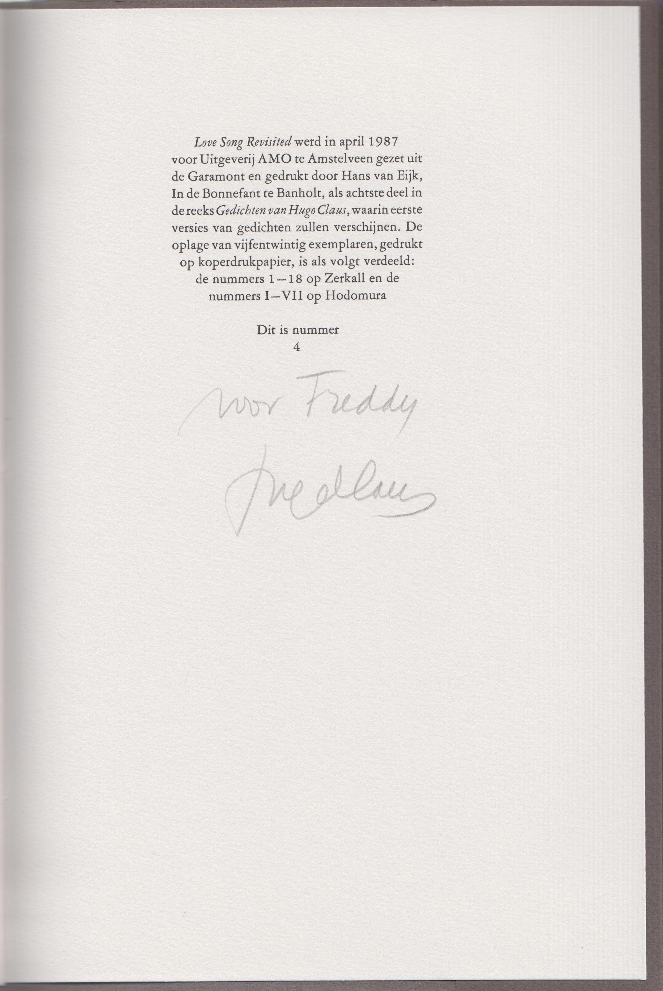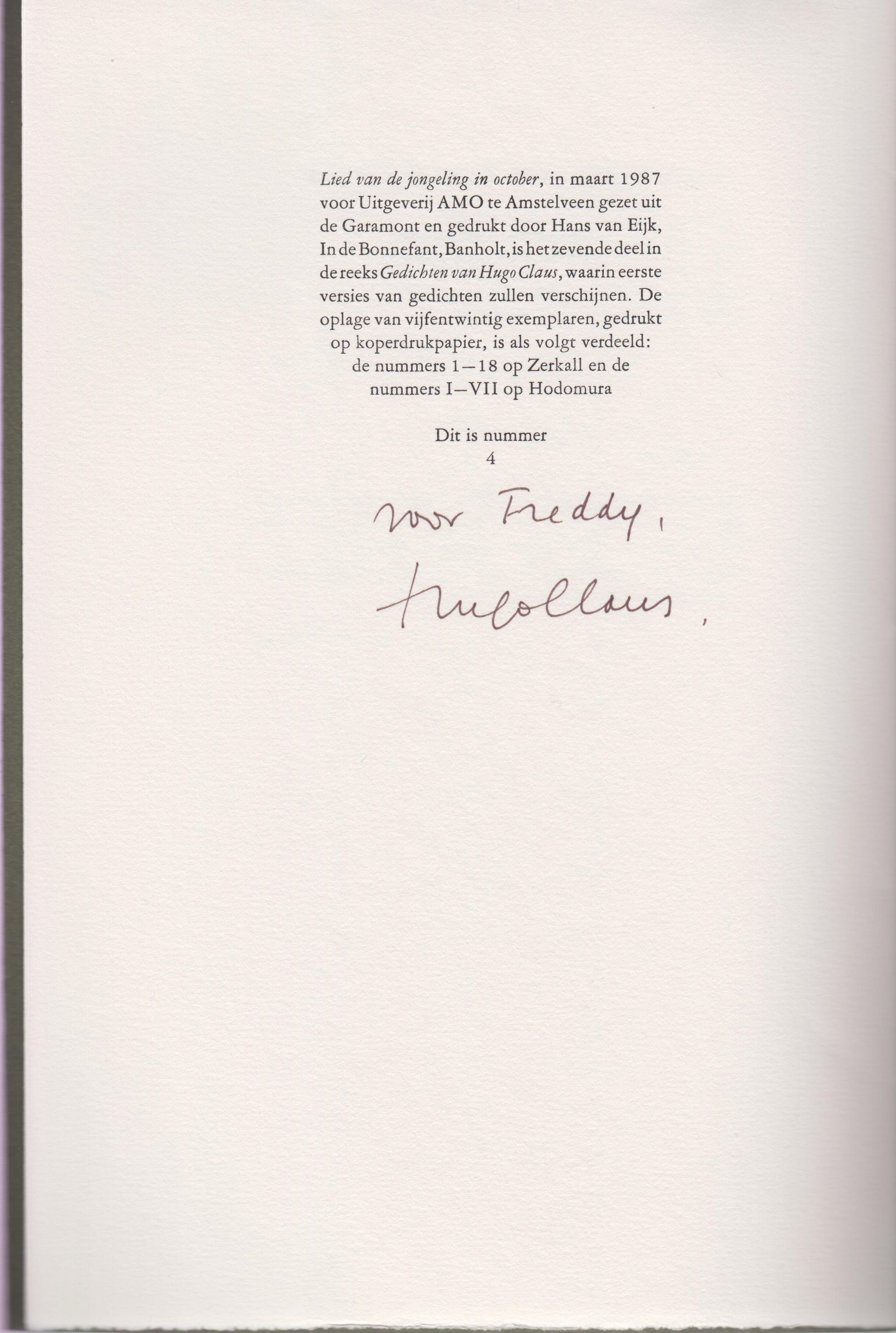 * Eén van de 18 Arabisch genummerde exemplaren op Zerkall. Dit is nummer 4, met onder het colofon een handgeschreven opdracht van de dichter aan Freddy De Vree: ‘voor Freddy/ Hugo Claus’.