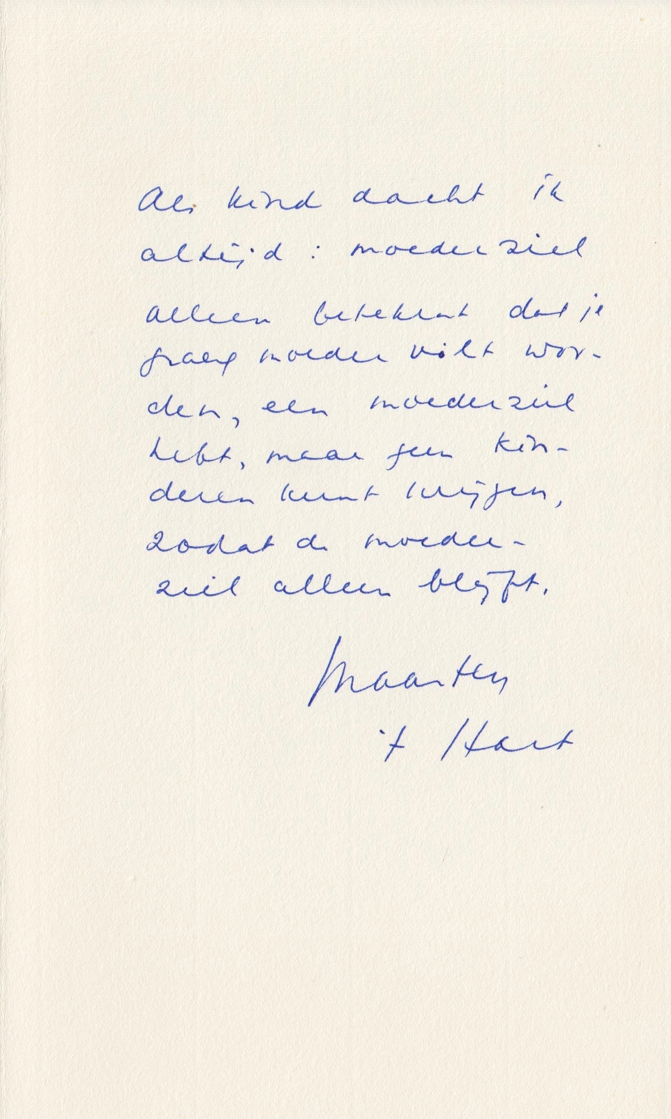 12. HART, Maarten ‘t ‘Als kind dacht ik altijd (…)’. Origineel handschrift. Vouwblad. Gevergeerd papier. 19,5 x 11,7 cm. Gesigneerd ‘Maarten ’t Hart’. 9 regels tekst.