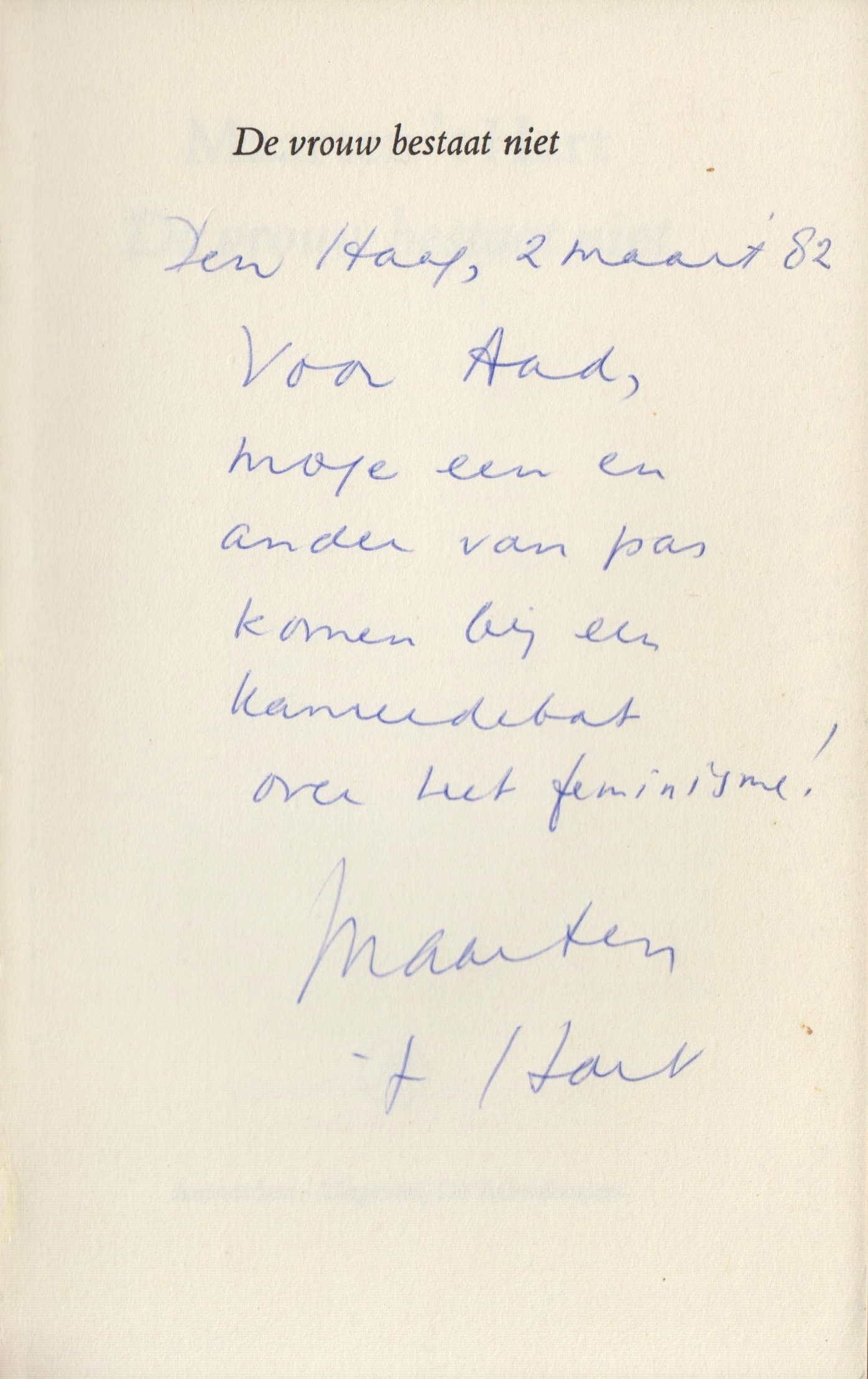 * Exemplaar met handgeschreven, gesigneerde opdracht van de auteur op de Franse titel: ‘Den Haag, 2 maart ’82/ Voor Aad [Nuis],/ moge een en/ ander van pas/ komen bij een/ kamerdebat/ over het feminisme!/ Maarten/ ’t Hart’.