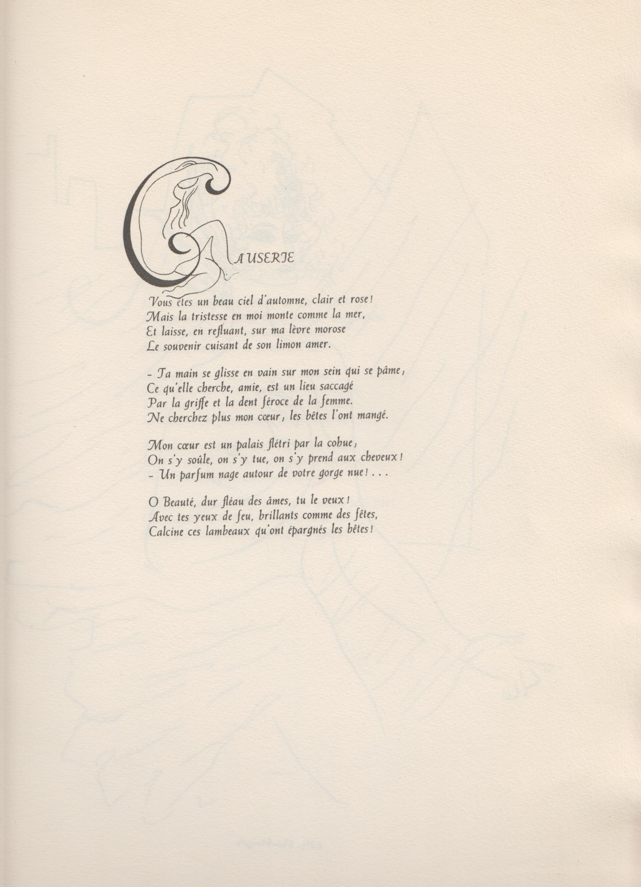 5. BAUDELAIRE, Charles Douze poèmes. Les fleurs du mal. Den Haag, D.A. Daamen, 1939 [= 1943]. 35 x 25 cm. Ingenaaid. (36) p. Lettrines en illustraties van C.A.B. Bantzinger. Gedrukt op Hollandsch in een oplage van 500 genummerde exemplaren. 1e druk. Bovenrand wat gekreukt, enkel roestvekje, maar verder een fris, keurig exemplaar.