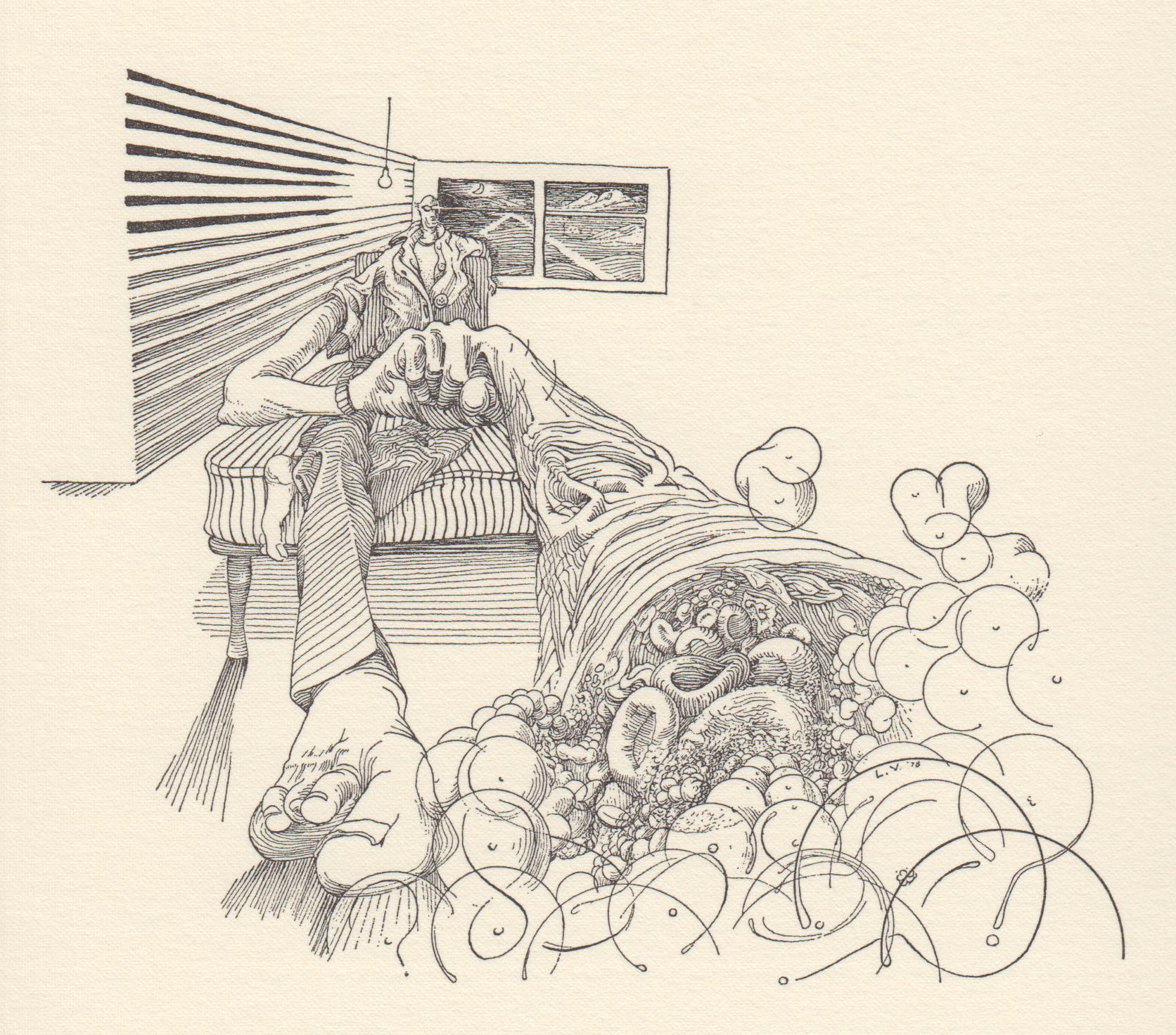 26. GRUNBERG, Arnon Ushi en Septembrius. Met (11 gemonogrammeerde) tekeningen van Bruno Vekemans. Wildert, De Carbolineum Pers, 1994. Ingenaaid in omslag van Moulin de Larroque. 28 p. Met de hand gezet uit de Erasmus en gedrukt in blauw, rood en zwart op Snow Petal door Boris Rousseeuw in een oplage van 65 genummerde en door auteur en illustrator gesigneerde exemplaren. 1e druk.