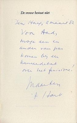 * Exemplaar met handgeschreven, gesigneerde opdracht van de auteur op de Franse titel: ‘Den Haag, 2 maart ’82/ Voor Aad [Nuis],/ moge een en/ ander van pas/ komen bij een/ kamerdebat/ over het feminisme!/ Maarten/ ’t Hart’.