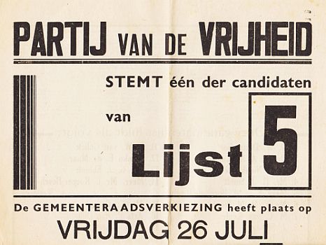 * Een vroege versie van de Partij voor de Vrijheid van Geert Wilders, de Partij van de Vrijheid! Werving voor de gemeenteraadsverkiezingen van 26 juli 1946. In 1948 ging de Partij van de Vrijheid samen met de beweging van Pieter Oud om de VVD te vormen. Op de kandidatenlijst staan weinig bekende figuren, maar ze hebben wel bekende achternamen: Nijgh, Nypels, Biegel en Bastet.