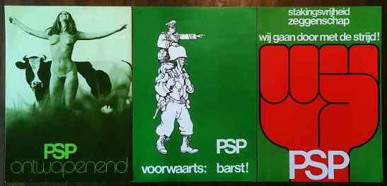 1. PSP ontwapenend. Het bekende affiche (ontworpen door George Noordanus) met de vrolijke naakte vrouw en de koe die de kiezer van achter haar langs bekijkt.