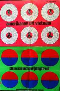 37. WOLKERS, Jan Amerikanen uit Vietnam. Steun aan het bevrijdingsfront. Zonder plaats, Komitee Hulp Bevrijdingsfront Vietnam, [1968]. 76 x 50 cm. Eenzijdig bedrukt in felrood en groen met blauw en zwart, in druk gesigneerd in de rechterbovenhoek. Gebruikt exemplaar met punaisegaatjes en een stukje plakband. Gevouwen, wat gevlekt.