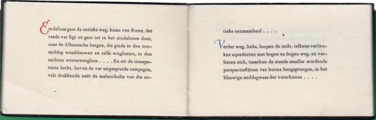 20. COUPERUS, Louis Via Appia. Haarlem, Carlina Pers, 1972. Oblong. 5,1 x 8,2 cm. Ingenaaid. (20) p. Met de hand gezet uit de 6 punts De Roos Romein en gedrukt in rood en zwart in een oplage van 48 exemplaren.