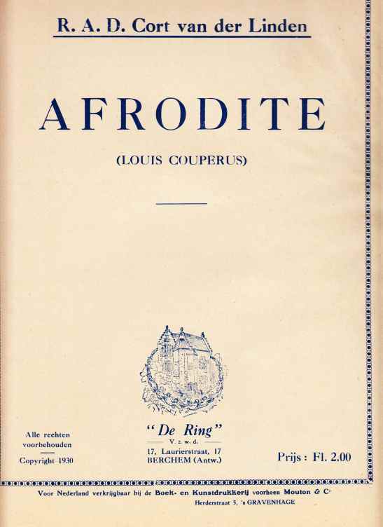 1. COUPERUS, Louis Afrodite. (Gedicht van Louis Couperus. Toonzetting van R.A.D. Cort van der Linden). Berchem (Antwerpen), De Ring, 1930 Folio. (6) p.