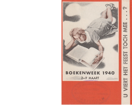 11. (BOEKENWEEK 1940) U viert het feest toch mee…? Folder voor de Boekenweek van 2-9 maart 1940. 4 p. Gedrukt in oranje, bruin en zwart. Met vaag stempel van een boekhandel in Amsterdam.