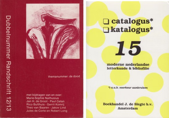 5. (DE SLEGTE) Catalogus/Katalogus 15. Moderne Nederlandse letterkunde & bibliofilie. Amsterdam, Boekhandel J. de Slegte b.v., 1996. Ingenaaid. 64 p + los vel Addendum. Illustraties. 1e druk.