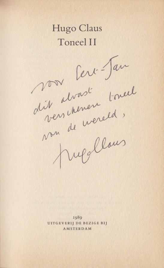* Exemplaar met handgeschreven, gesigneerde opdracht van de auteur op de titelpagina: ‘voor Gert-Jan,/ het zoveelste,/ (en d’r komen d’r nog!)/ van harte/ Hugo Claus’. BHC 145.