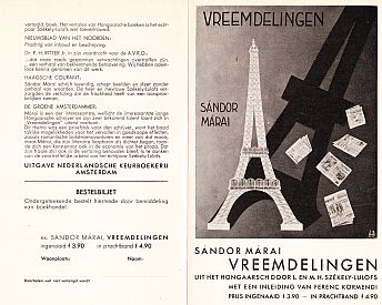 30. (NEDERLANDSCHE KEURBOEKERIJ). MÁRAI, Sándor Sándor Márai. Vreemdelingen. & Mihály Földi, De ziel van Anna Kádár. (2 x uitgeversprospectus). Amsterdam, Nederlandsche Keurboekerij, (ca. 1934-1935). Twee vouwbladen. Beide met afbeelding van het omslag. Nette exemplaren.