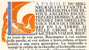 31. (NYPELS, Charles) La prophétie de Ioel. (With illustration in colors, two-color initials and large publisher’s vignette by Henri JONAS.) (INSCRIBED by Nypels). (Maastricht, Leiter-Nypels, 1923). 31 x 23 cm. Cloth-backed boards. 32 p. Printed in 220 numbered copies on Haesbeek laid paper. First edition. Spine worn, boards foxed, but splendid inside.