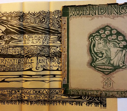 44. WENDINGEN Houtsnedennummer. Volume II No. 7/8. Amsterdam, De Hooge Brug, [november] 1919. Dedicated to woodcuts 34 x 33 cm. Original covers (design R. N. Roland Holst, printed in green, purple and gold), stitched with raffia. 60 p. 1st edition. Overlapping cover damaged at the edges, but the inside and all the woodcuts are in excellent condition.