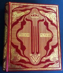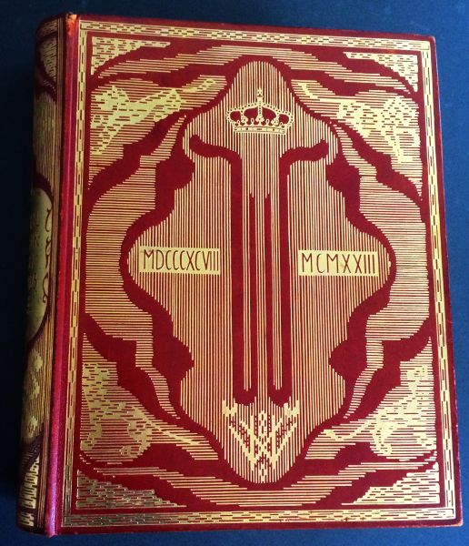 24. (LION CACHET, C.A.). BRUGMANS, H. (red.) Officieel gedenkboek uitgegeven namens de Huldigingscommissie 1923 te Amsterdam ter gelegenheid van het vijf en twintig jarig Regeeringsjubileum van Hare Majesteit Koningin Wilhelmina Helena Pauline Maria. (Luxe editie). Amsterdam, Van Holkema & Warendorf/ J.H. de Bussy, 1923. 29 x 23 x 6 cm. Schitterende originele band van rood leer, rijk verguld, naar ontwerp van C.A. Lion Cachet. Kop verguld. Rood gemarmerde schutbladen. (8), 592 p. Geïllustreerd. Met vignetten en decoraties van Lion Cachet. 1e druk. Heel lichte slijtage op de bovenste rughoeken en onderranden. Boekverkopersmerkje aan de binnenkant van mede-uitgever J.H. de Bussy. Uitstekende conditie.